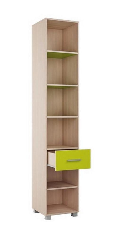 • Стеллаж состоит из открытого отсека с полками цвета Лайм, которые крепятся при помощи скрытого крепежа «Флиппера», выдвижного ящика, цвет фасада - Лайм и закрытой распашной створкой, секцией с полкой, цвет створки - Синий.